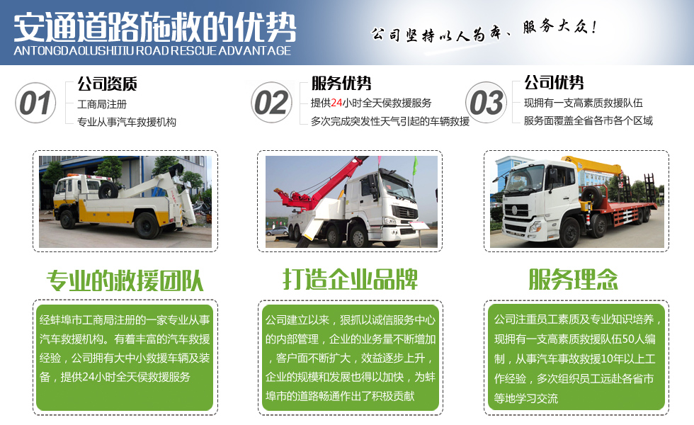 安徽安通道路施救服務(wù)有限公司蚌埠分公司 安徽安通道路施救服務(wù)有限公司蚌埠分公司是經(jīng)蚌埠市工商局批準(zhǔn)注冊(cè)的具有專(zhuān)業(yè)汽車(chē)救援資質(zhì)的企業(yè)。安通救援集聚十幾年的汽車(chē)救援經(jīng)驗(yàn),公司配有大中小型救援車(chē)輛及各式裝備,提供24小時(shí)全天侯救援服務(wù)。公司堅(jiān)持以人為本、以服務(wù)大眾為宗旨,曾多次在惡劣環(huán)境條件下成功完成車(chē)輛搶險(xiǎn)救援作業(yè),贏(yíng)得廣大客戶(hù)好評(píng)及信賴(lài),專(zhuān)業(yè)/迅捷/高效的安通救援團(tuán)隊(duì),為您的行程安全保駕護(hù)航 一、安通救援、誠(chéng)信 誠(chéng)實(shí)守信是市場(chǎng)競(jìng)爭(zhēng)的必要條件,同時(shí)也是企業(yè)立足市場(chǎng)之根本。安通救援注重科學(xué)管理,秉持誠(chéng)信經(jīng)營(yíng)理念。 公司自成立以來(lái),穩(wěn)抓誠(chéng)信服務(wù)中心的內(nèi)部管理,為蚌埠市及周邊城市的道路暢通作出了積極貢獻(xiàn)。 二、規(guī)范化管理,企業(yè)發(fā)展之動(dòng)力 2010年我公司引進(jìn)國(guó)內(nèi)清障車(chē)投入到道路清障保暢服務(wù)中。從此,一支統(tǒng)一車(chē)色、統(tǒng)一服飾、統(tǒng)一標(biāo)志的清障保暢隊(duì)伍,活躍在省內(nèi)及各省際高速公路上。安通救援在成功的道路上邁出了關(guān)鍵的一步,開(kāi)創(chuàng)了民營(yíng)企業(yè)內(nèi)部規(guī)范...